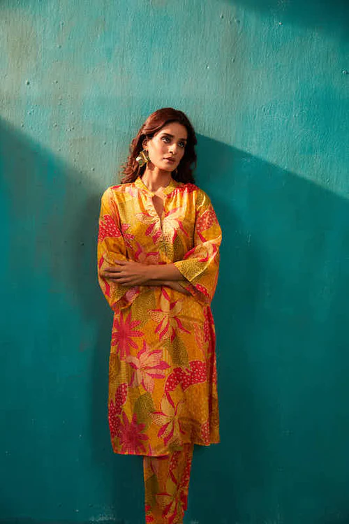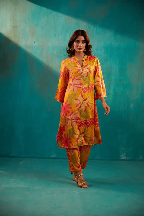 Yellow Floral Long Kurta Co-Ord Set