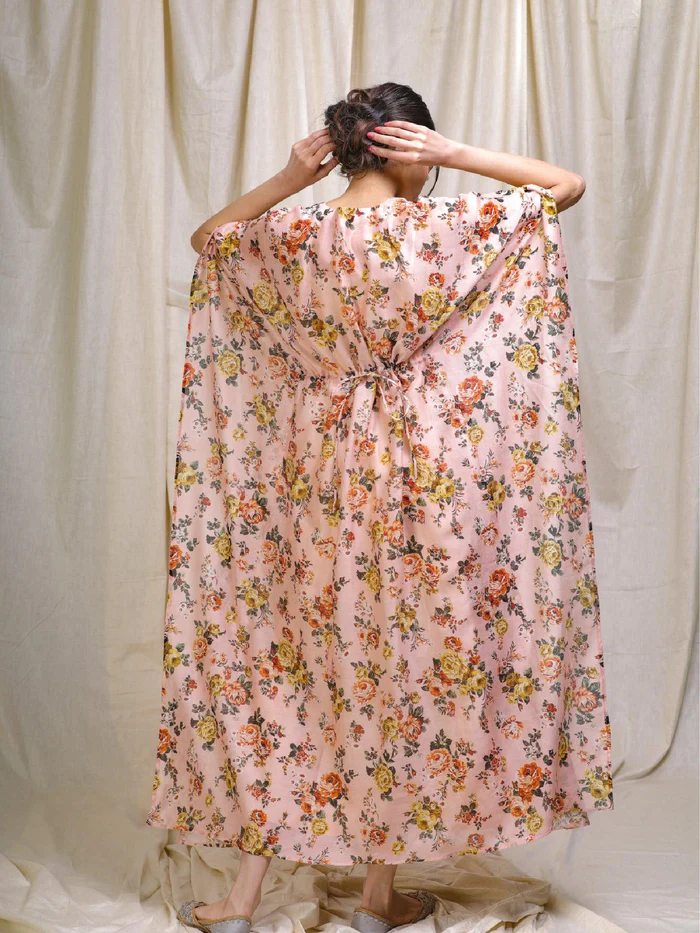 Blush Peach Floral Chanderi Kaftan