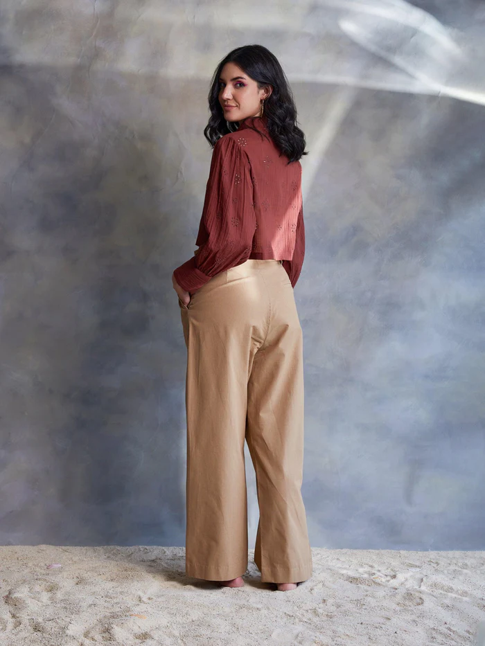 The Brown Cut Work Crop Shirt is a chic and trendy piece that effortlessly combines sophistication with a modern edge. Crafted from high-quality fabric, this shirt features intricate cutwork detailing that adds a touch of elegance to its contemporary design. The warm brown hue enhances its versatile appeal, making it a perfect addition to any wardrobe.