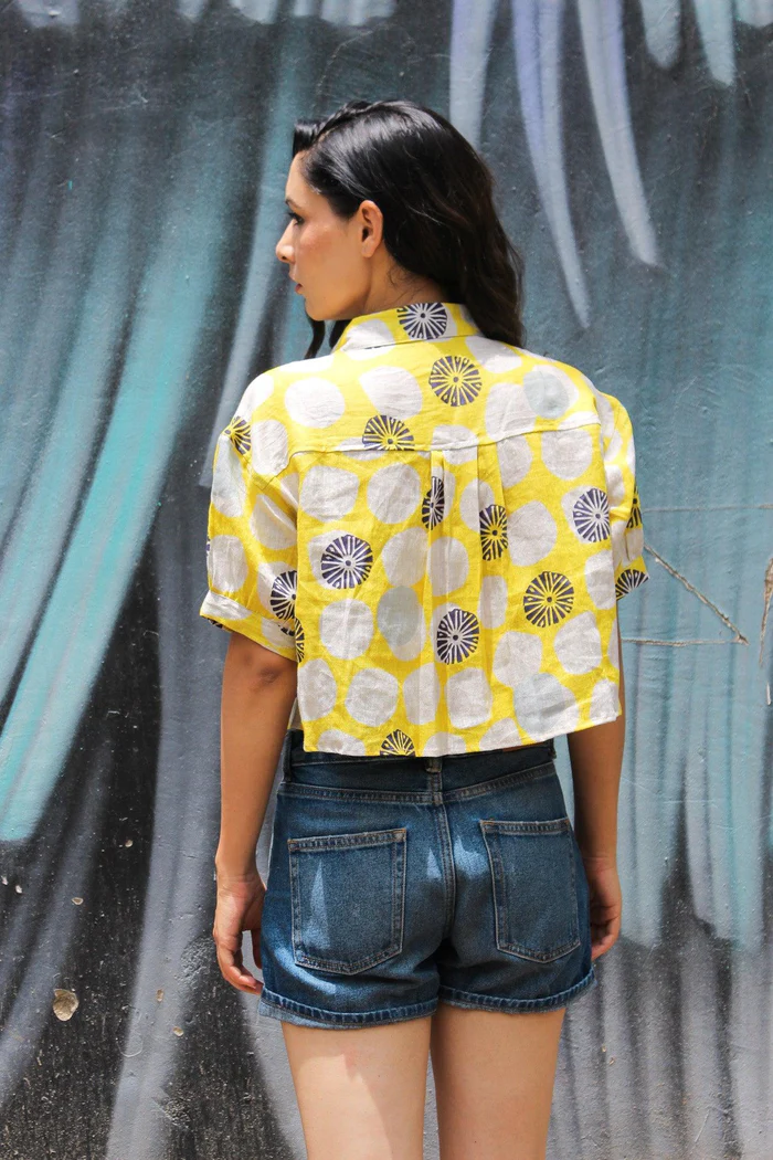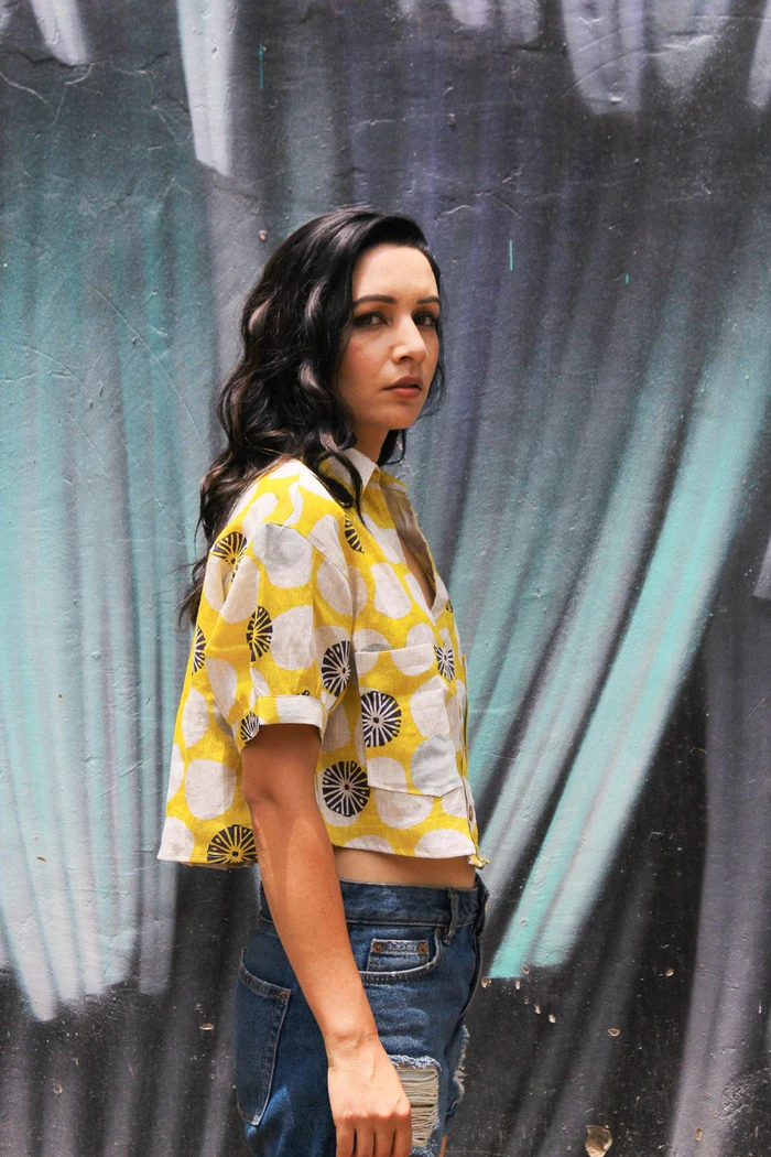 Cropped collared shirt made out of 100% sustainable cotton linen. Short sleeves with gathers, front patch pockets and a buttoned up front. Breezy and fun for a hot summer day!