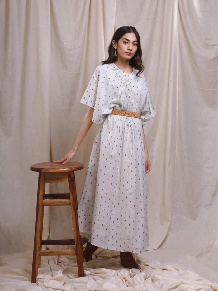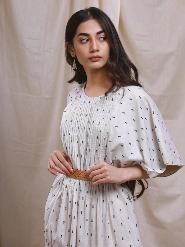Handcrafted in Mulmul with intricate hand weaving, this flared dress with kaftan style sleeves detailed and back drawstring, with pintucks in the front for a delicate touch. Style it with a belt and you’re good to go on a perfect day out! Our outfits are all Free-Sized and come with a drawstring at the back for adjusting the outfit and yet providing the ultimate comfort.