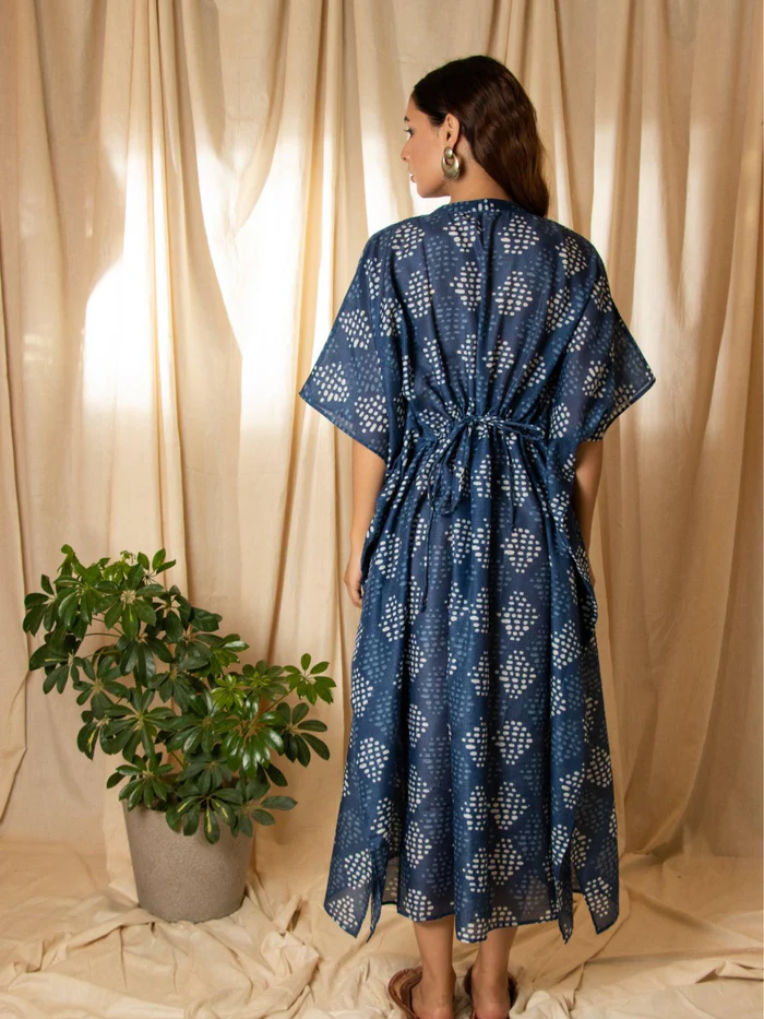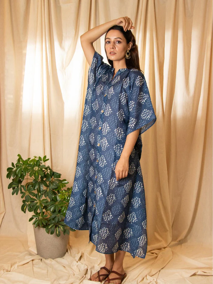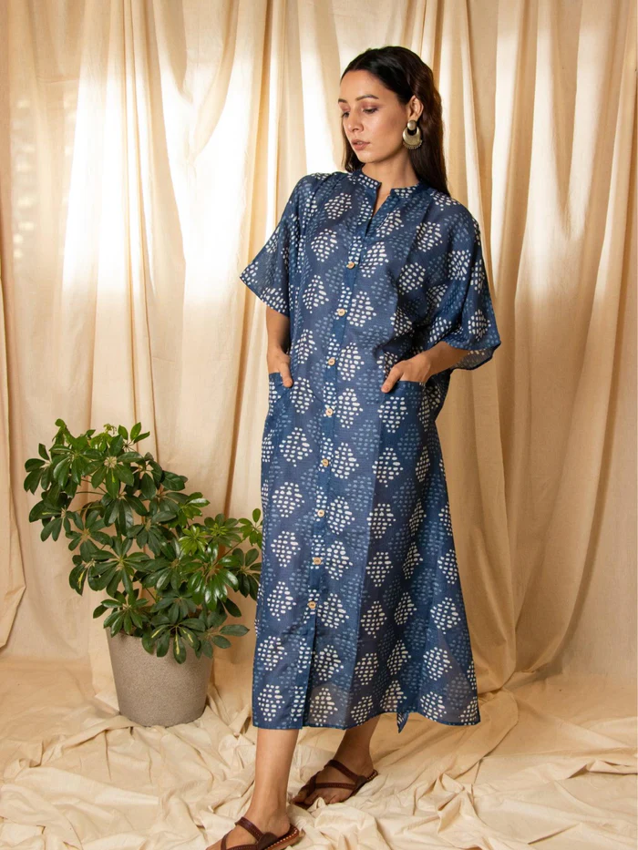 Neel Indigo Kaftan with front buttons and pockets for the ultimate comfort and style. Our outfits are all Free-Sized and come with a drawstring at the back for adjusting the outfit and yet providing the ultimate comfort.