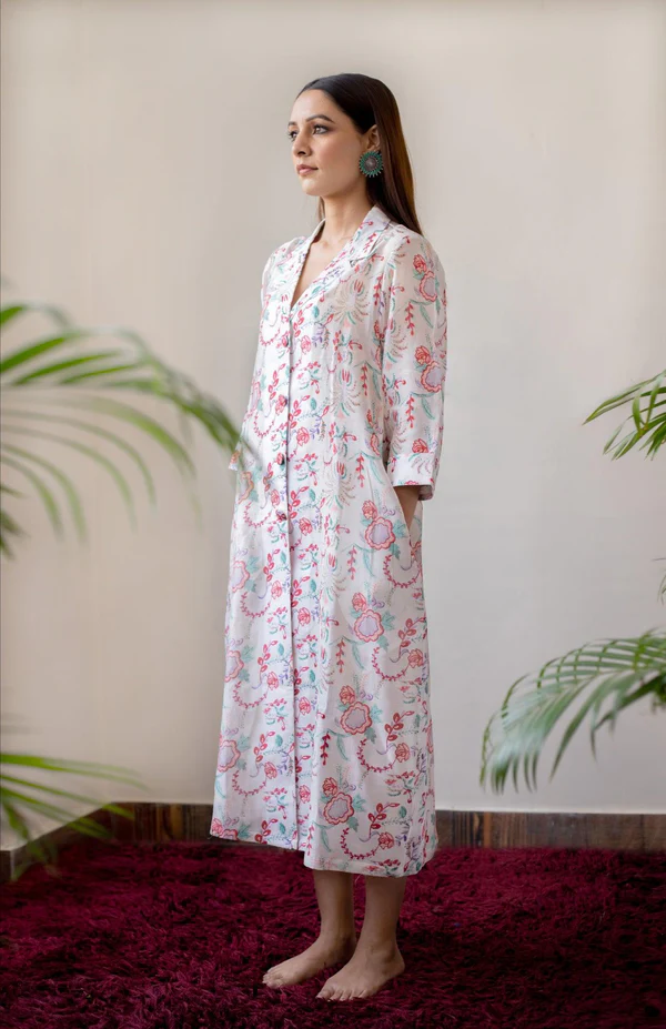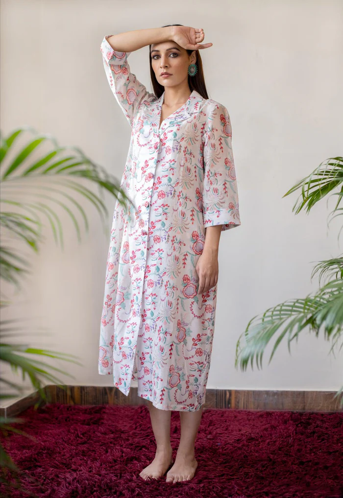 A delicate chanderi shirt dress in an elegant ivory floral block style print, front buttons is a perfect festive wear in comfort.