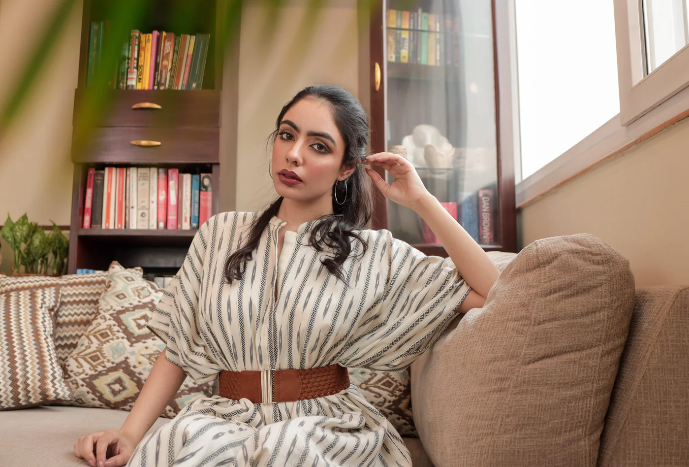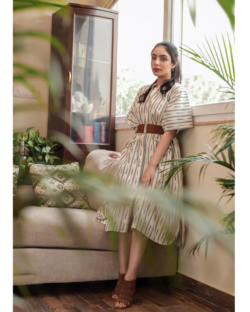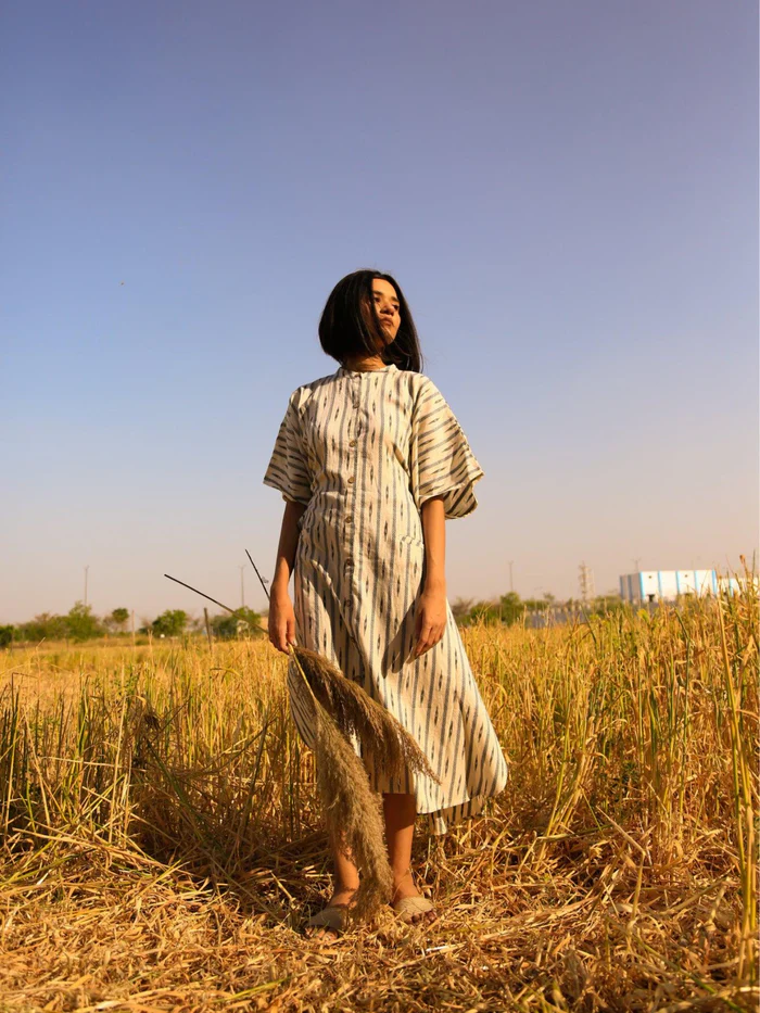 Handcrafted in Cotton Linen and an intricate ikat weave. This kaftan style dress along with a buttoned up front and back drawstring is a perfect balance between fun and comfort. Our outfits are all Free-Sized and come with a drawstring at the back for adjusting the outfit and yet providing the ultimate comfort.