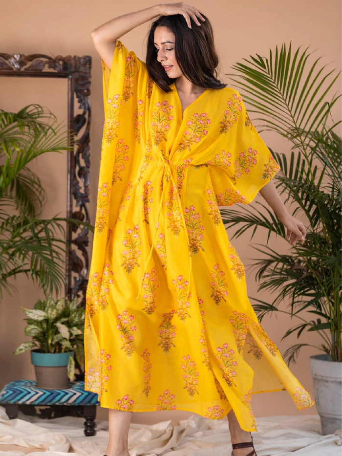 Liba – Yellow Block Print Pintuck Kaftan