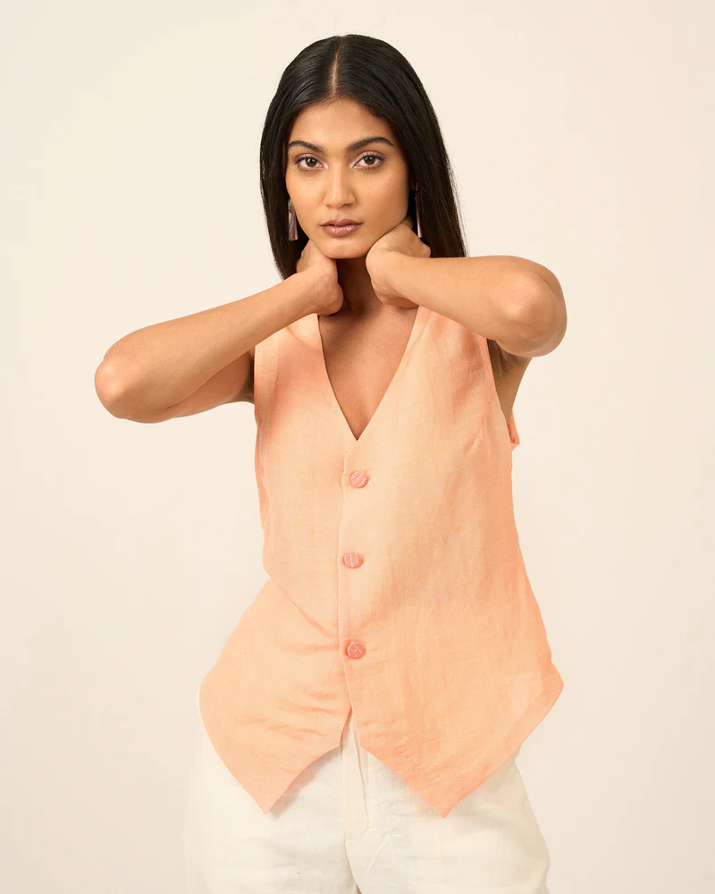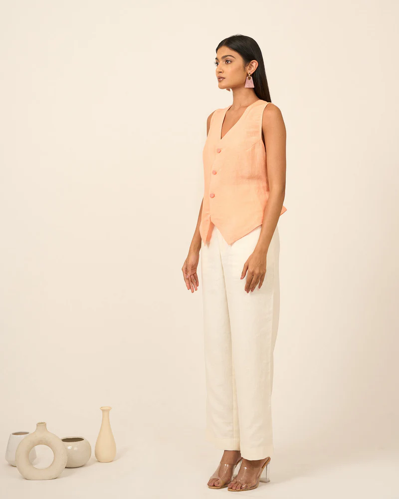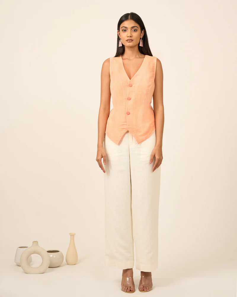 This set comes with a pure linen waistcoat and solid linen straight-fit pants. With pocket detailing on the waistcoat. A perfect summer essential co-ord set.