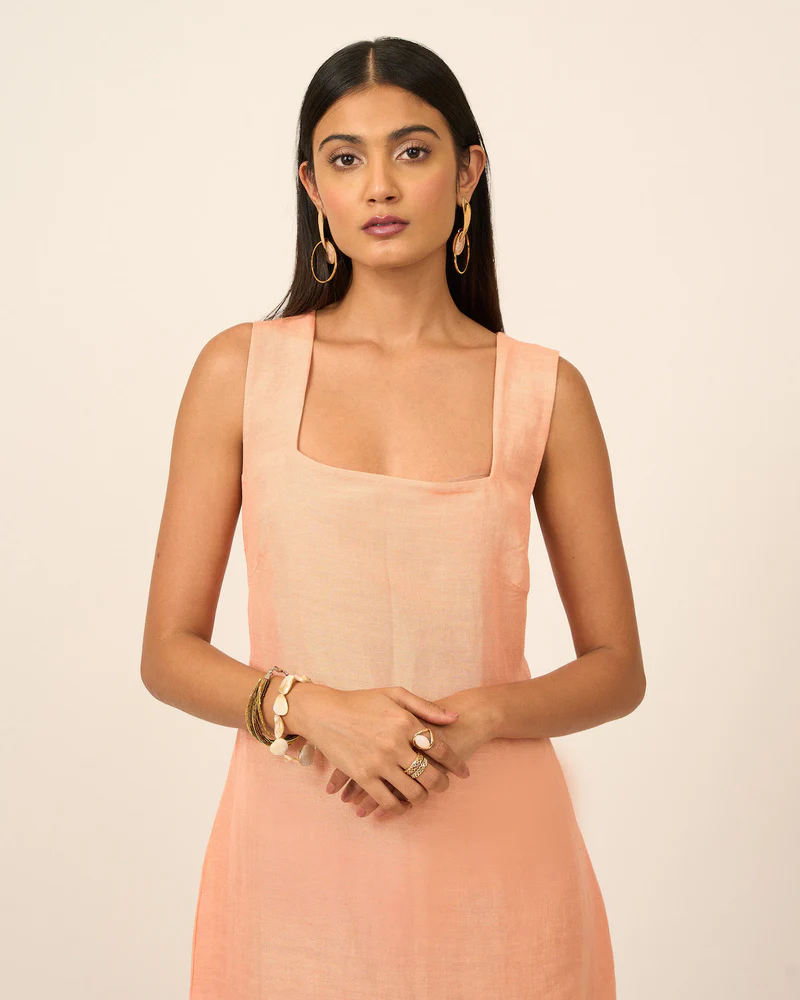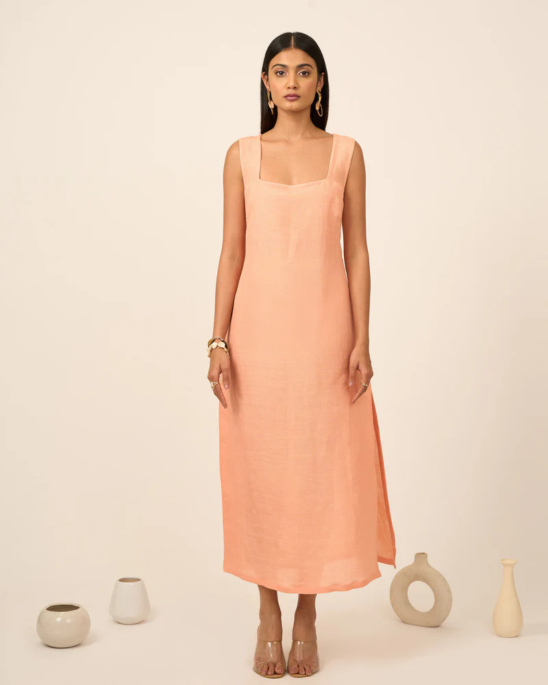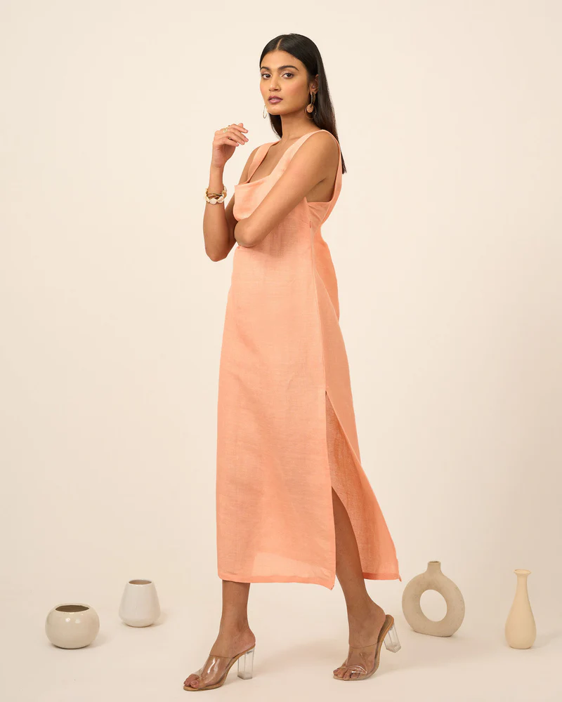 Salmon Pink Linen Midi Dress With Side Slit