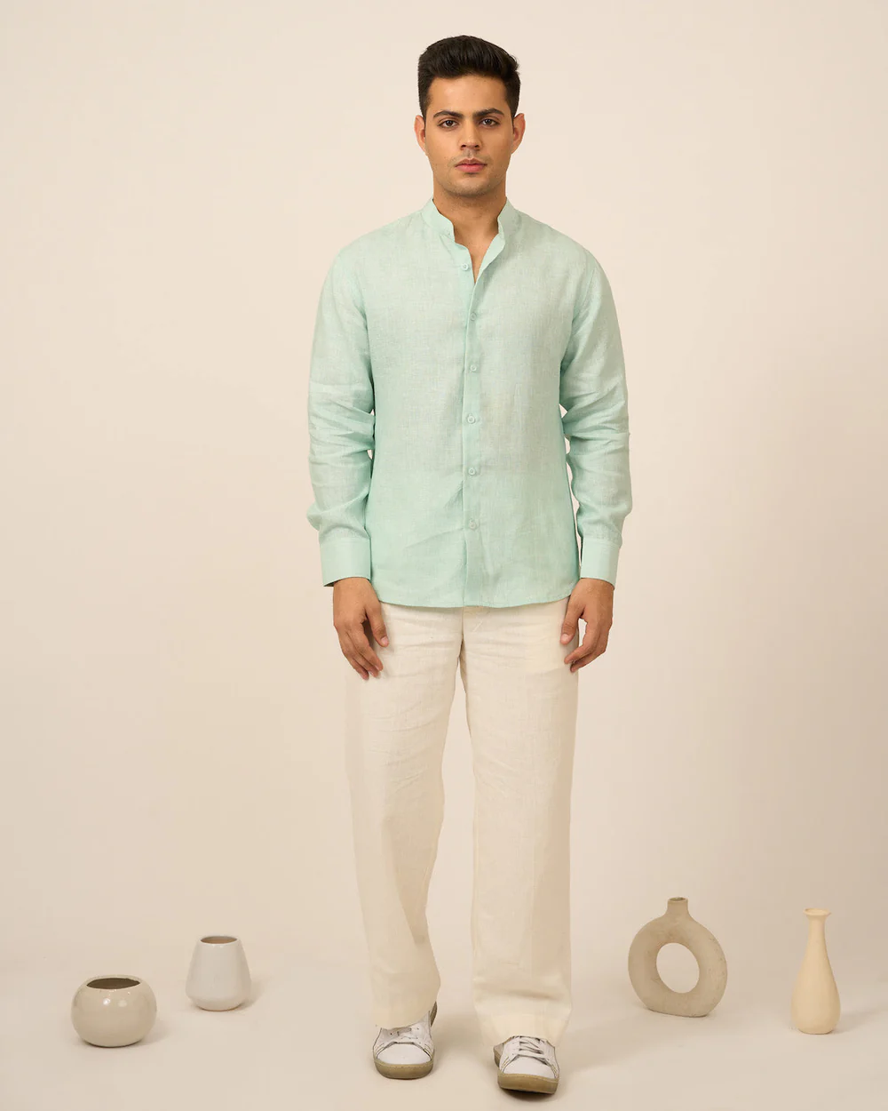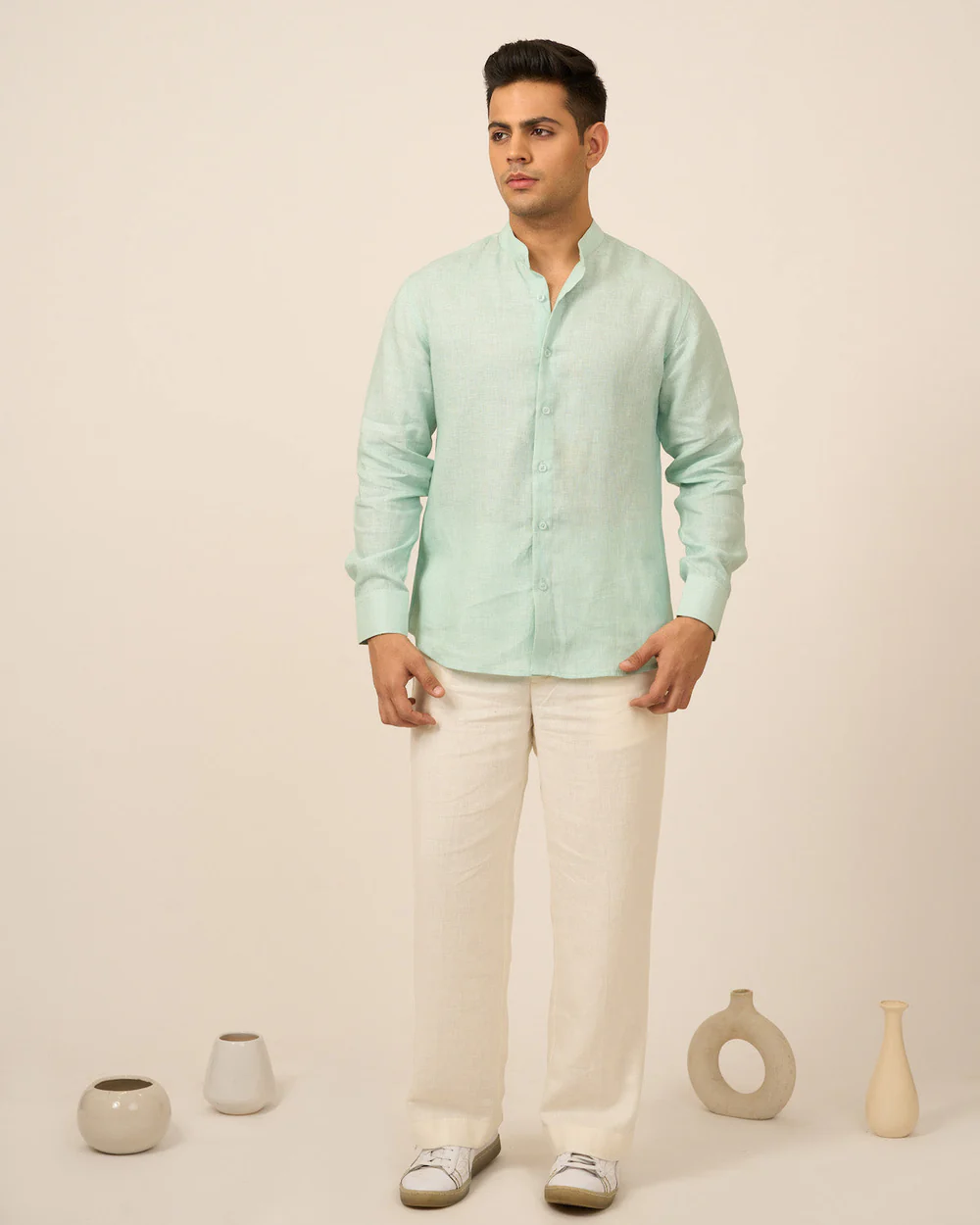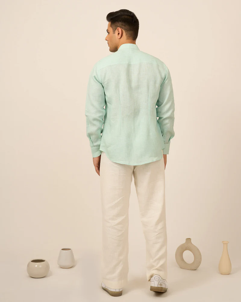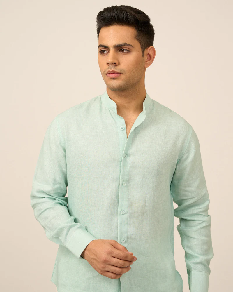 This shirt comes in pure linen and mandarin collar. Perfect breezy fit for this summer season.