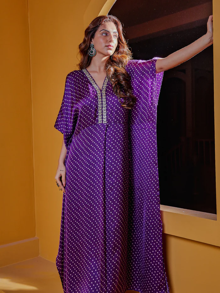 Perfect vacation wear this year with a bandhani print on a beautiful luxurious satin. Kaftan with a box pleat detailing on the front york, a zari lace and a back tie for the fitting.