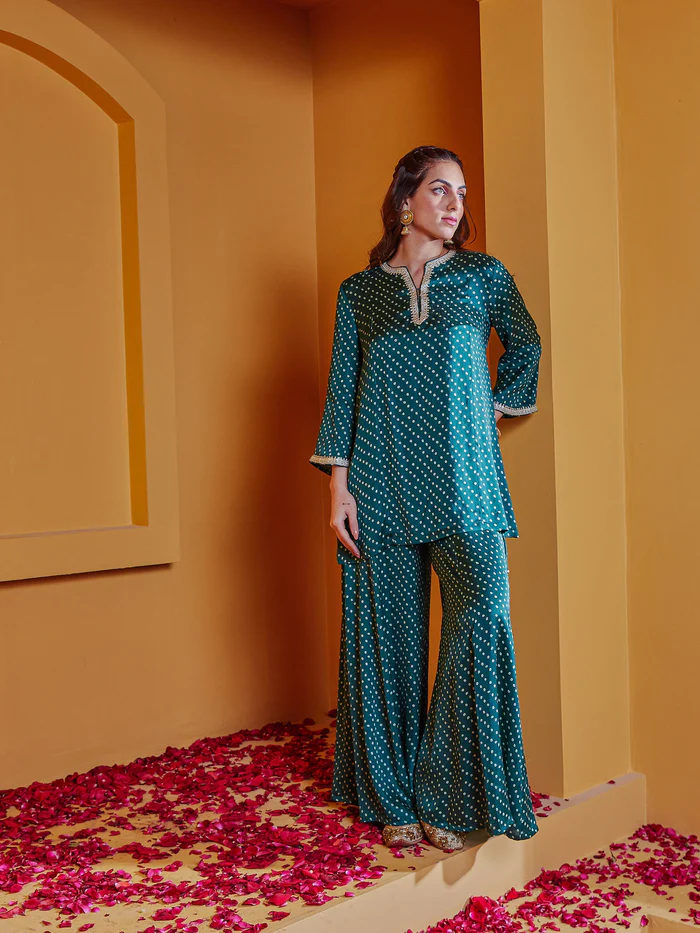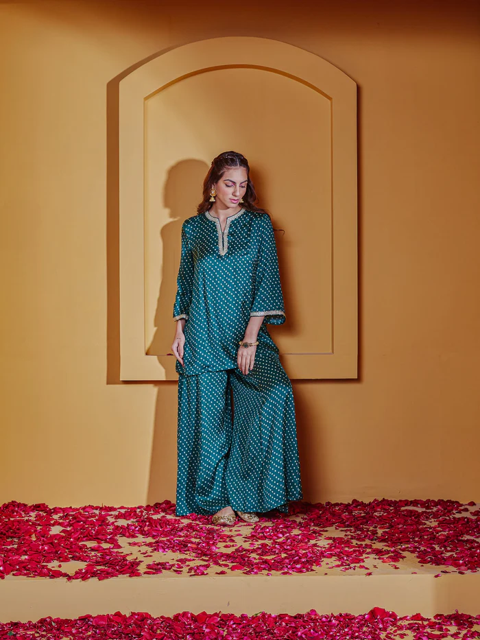 The beautiful color tones in this stunning satin printed sharara set give it a perfect look for a festive day or evening event.